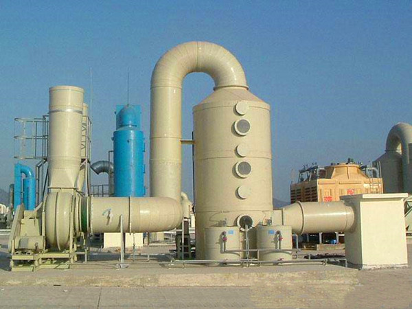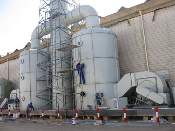 上圖為安裝完按成的廢氣處理工程,其中包括玻璃鋼離心風(fēng)機(jī)、廢氣處理塔、循環(huán)水箱以及通風(fēng)管道。