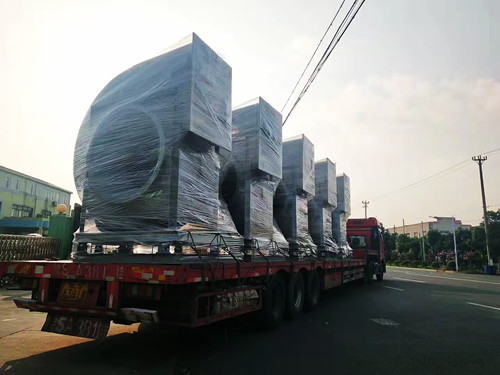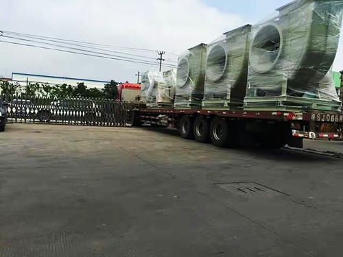 風機的整體尺寸會隨著型號的變大而增加,但是從運輸與安裝的角度考慮,一般最大型號的玻璃鋼離心風機高度極限為3米左右。這種型號的風機對應為14C,長度在2.5-3.5米左右,高度在3米左右。如果需要處理的風量比較大,可使用多臺風機搭配使用。下面是多臺大型號的玻璃鋼離心風機發貨圖。
