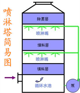 所謂的玻璃鋼噴淋塔,即采用噴淋的方式來達(dá)到凈化廢氣的效果。如下圖所示,由泵將比例噴淋塔底部的吸收液經(jīng)由噴淋管送至塔體內(nèi)部由噴淋嘴噴出并經(jīng)由填料層與廢氣進(jìn)行充分的接觸。