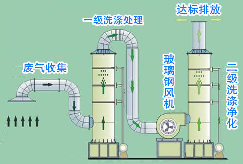 玻璃鋼洗滌塔在使用的時候均與玻璃鋼風機搭配使用(參照上圖)。兩者之間使用玻璃鋼風管和彎頭等配件連接在一起。