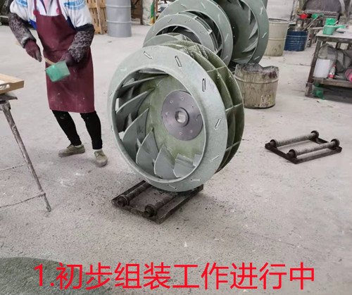 a、首先是將玻璃鋼風(fēng)機(jī)葉輪需要的配件單獨(dú)制作出來(lái),如葉片、底座、頂蓋、等。然后人工進(jìn)行組裝,組裝工作完成之后再使用樹脂混合材料進(jìn)行加固。